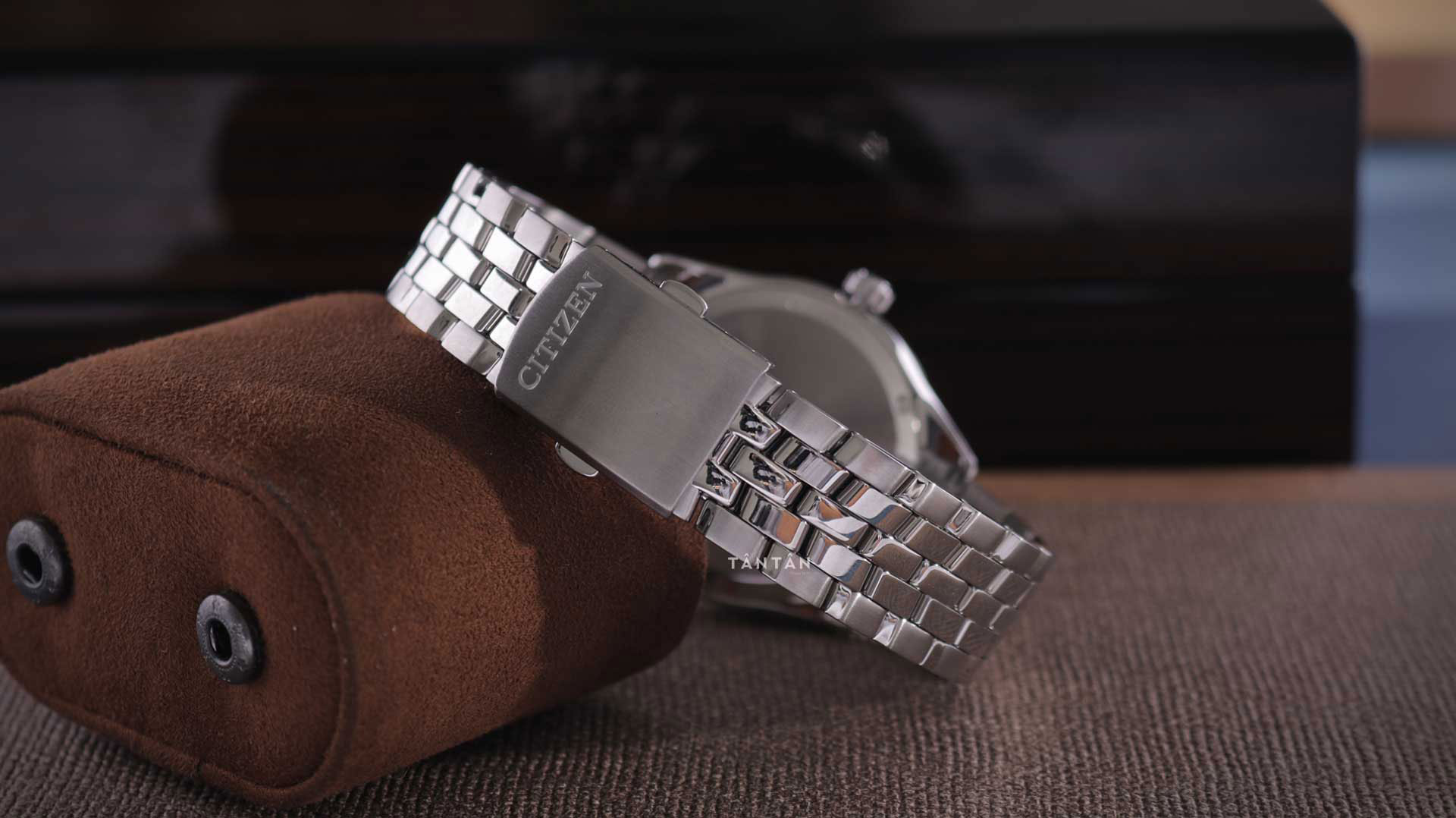 Với thiết kế 5 mắt xen kẽ uyển chuyển và thoáng khí, toàn bộ dây được làm từ thép không gỉ chắc chắn với sự kết hợp xen kẽ giữa những mắt được đánh bóng và sớ mờ. Dây đồng hồ với tông màu trắng bạc cùng với bộ vỏ tạo thành 1 khối đồng nhất, giúp chiếc đồng hồ trông sang trọng, mạnh mẽ và cuốn hút hơn. Đi cùng theo đó là phần khóa gập với logo Citizen được khắc chìm sắc sảo, tích hợp nút bấm thông minh thuận tiện cho thao tác tháo ra - đeo vào.