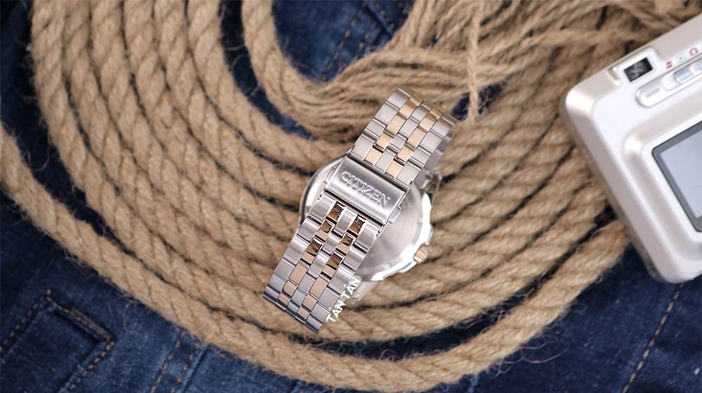 Với tiêu chí đặt chất lượng sản phẩm lên hàng đầu, Citizen luôn chú trọng về mọi chi tiết ở sản phẩm của mình. Toàn bộ dây được làm từ thép không gỉ với thiết kế 5 mắt tạo cảm giác ôm sát cổ tay, kết hợp xen kẽ giữa đánh bóng mạ màu vàng hồng và đánh thớ mờ tạo độ sắc sảo nhất định cho bộ dây. Những mắt dây nhỏ gắn kết với nhau vừa chắc chắn, vừa mềm mại cực kỳ ôm tay và tạo cảm giác thoải mái khi đeo. Đi cùng dây đeo là phần khóa gập với logo Citizen được dập chìm sắc sảo, tích hợp nút bấm thông minh thuận tiện cho thao tác tháo ra - đeo vào.