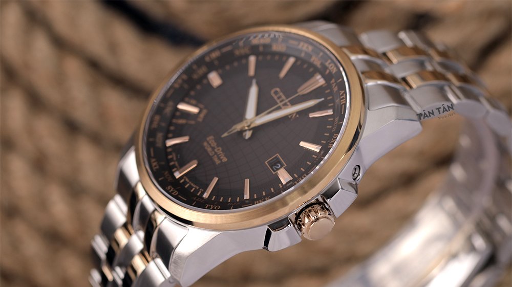 Citizen BX1006-85E được thiết kế tỉ mỉ, tinh tế, phần viền ngoài mặt số được khắc rõ tên 26 thành phố nổi tiếng trên toàn thế giới, để hiển thị múi giờ quốc tế World-time GMT. Dù ở bất kì đâu, bạn cũng có thể nắm bắt được thời gian của rất nhiều quốc gia và múi giờ trên thế giới, khi điều chỉnh kim giây đến thành phố bất kỳ. Ở góc 12 giờ là tên thương hiệu Citizen cao cấp, góc 6 giờ là bộ máy Eco-Drive và tính năng World-time, góc 8h là chức năng tắt/bật giờ mùa hè và ô lịch ngày được đặt gọn gàng trong khung thép đánh bóng chỉn chu ở góc 3h.