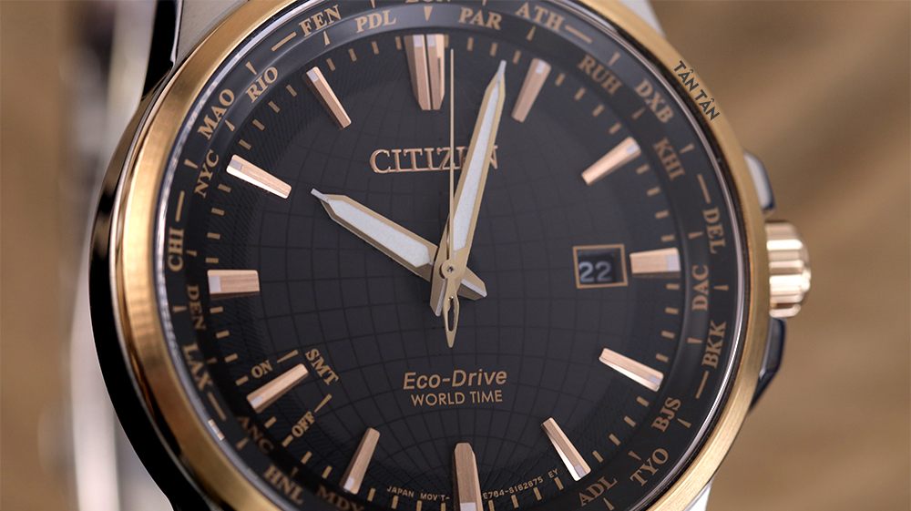 Mặt số màu đen nổi bật các chi tiết màu vàng hồng, hoàn thiện "địa cầu" biểu tượng chức năng Worldtime với tên 26 thành phố sát viền mặt số