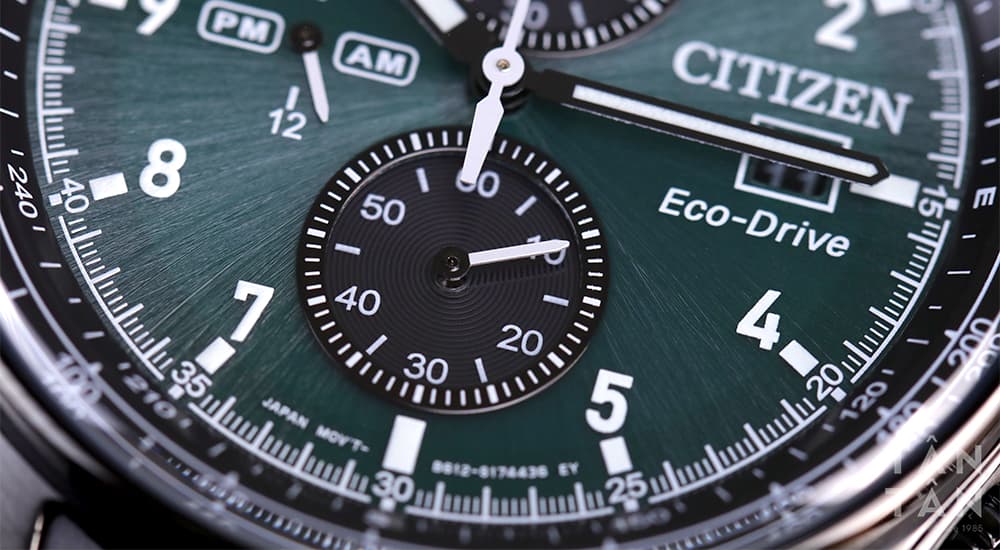 Citizen CA0775-87X được trang bị mặt số màu xanh lá đen Dark Green mới lạ hiếm có trên các mẫu đồng hồ nam. Những mẫu đồng hồ màu Green trước đây thường có độ tươi hơn nhiều, nhưng màu Dark Green trên Citizen CA0775-87X là sắc màu vừa nam tính, vừa mạnh mẽ, huyền bí mà cũng rất sang trọng khi kết hợp cùng vân chải tia đồng tâm tạo nên hiệu ứng đổi màu vô cùng bắt mắt ở nhiều góc sáng khác nhau.