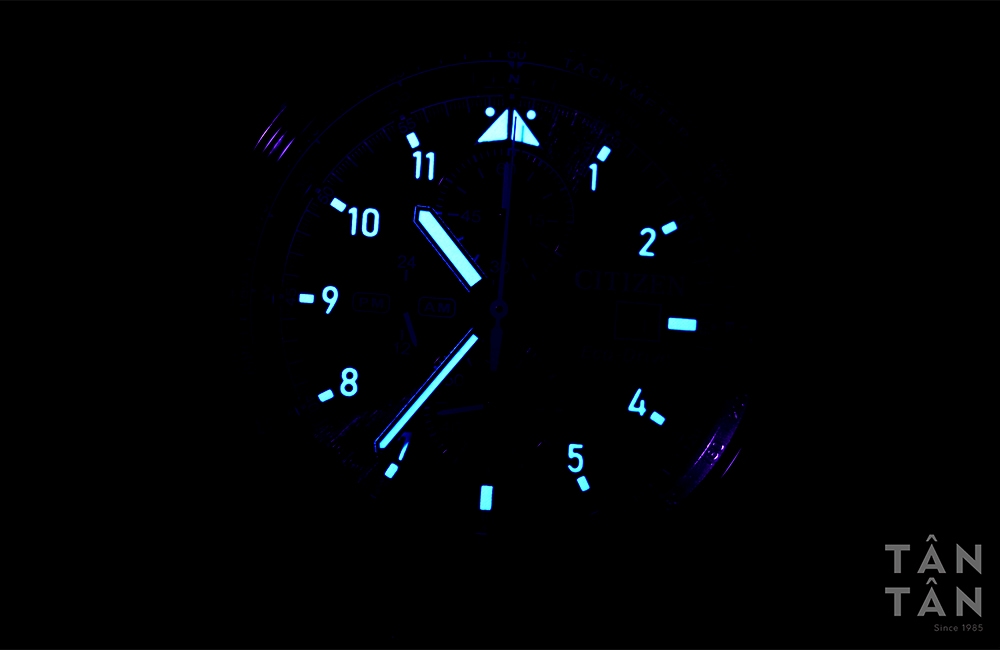 - Bộ kim chính và cọc số được phủ dạ quang, hiển thị rõ ràng trong trời tối.