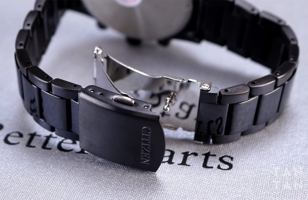 Đi cùng mặt số Dark Green hiện đại, nhà sản xuất còn trang bị cho Citizen CA0775-87X bộ dây thép màu đen hài hòa với mặt số. Thông thường khi sử dụng dây kim loại, các hãng đồng hồ thường chỉ sử dụng một màu trắng bạc duy nhất. Tuy nhiên với Citizen CA0775-87X, dây đeo có màu đen rất khác lạ tạo nên vẻ ngoài thanh lịch nhưng không kém phần quyến rũ.