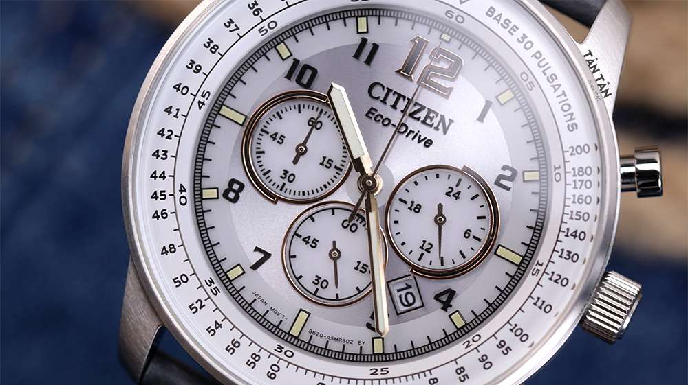 Đặc biệt, xung quanh viền ngoài mặt số là các chỉ số cho chức năng Đo nhịp tim - “base 30 pulsations” với 30 xung cơ bản để đếm nhịp tim với độ chính xác cao. Phương pháp này là phương pháp được sử dụng trong y tế để đo nhịp tim vừa nhanh vừa chính xác. Bắt đầu đếm nhịp tim trong 30 nhịp từ điểm đánh dấu 12 giờ và khi bạn đến 30, kim giây chỉ vào đâu là nhịp tim. Đây là tính năng bổ trợ khá nhiều khi vận động lặn sâu, di chuyển hoặc đang bay cũng là điểm cộng khiến chiếc đồng hồ nam Citizen CA4500-24H này đáng sở hữu hơn.