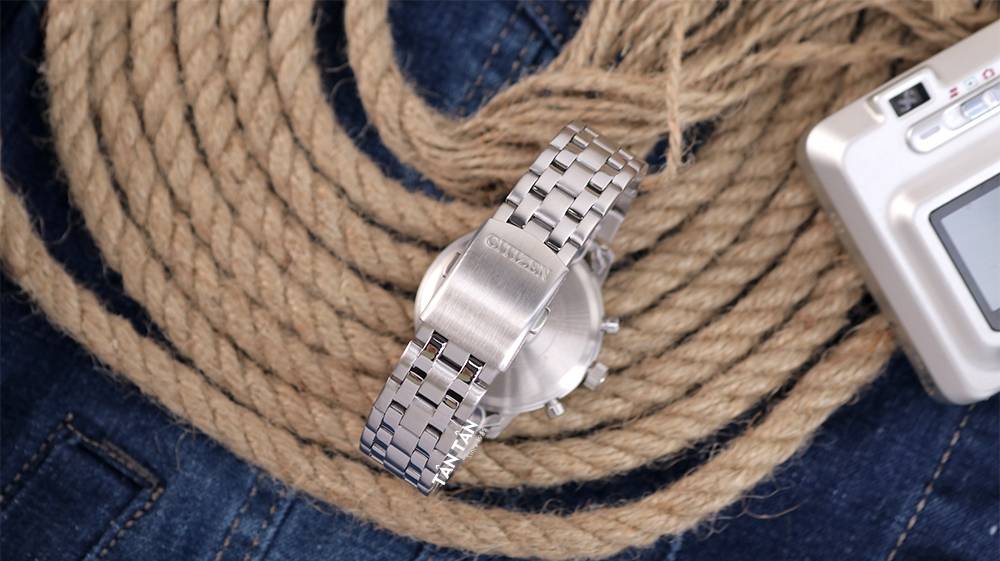 Citizen CA7060-88E sở hữu bộ dây thép không gỉ đồng điệu với bộ vỏ. Dây đeo thiết kế 5 mắt liên kết chắc chắn xen kẽ đánh bóng và phay xước tạo điểm nhấn, mang đến nét thẩm mỹ hiện đại và hợp thời trang hơn. Đi kèm với đồng hồ Citizen dây kim loại là khóa gập chắc chắn với nút bấm tiện lợi dễ dàng đeo vào tháo ra, cố định trên cổ tay không bung trong quá trình vận động mạnh.