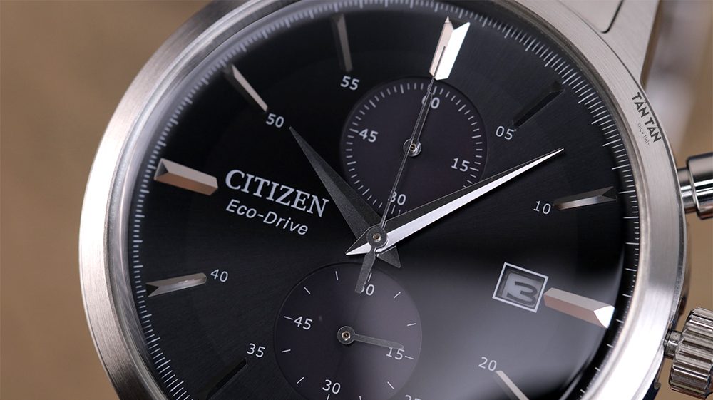Mặt số màu đen sunray với 2 mặt phụ chuẩn chronograph: 60 phút và 60 giây