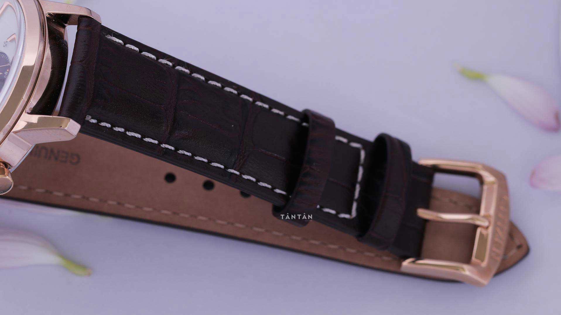 ✓ Bộ vỏ 42mm bằng thép không gỉ chắc chắn mạ PVD màu vàng hồng đi kèm dây da nâu lịch lãm.