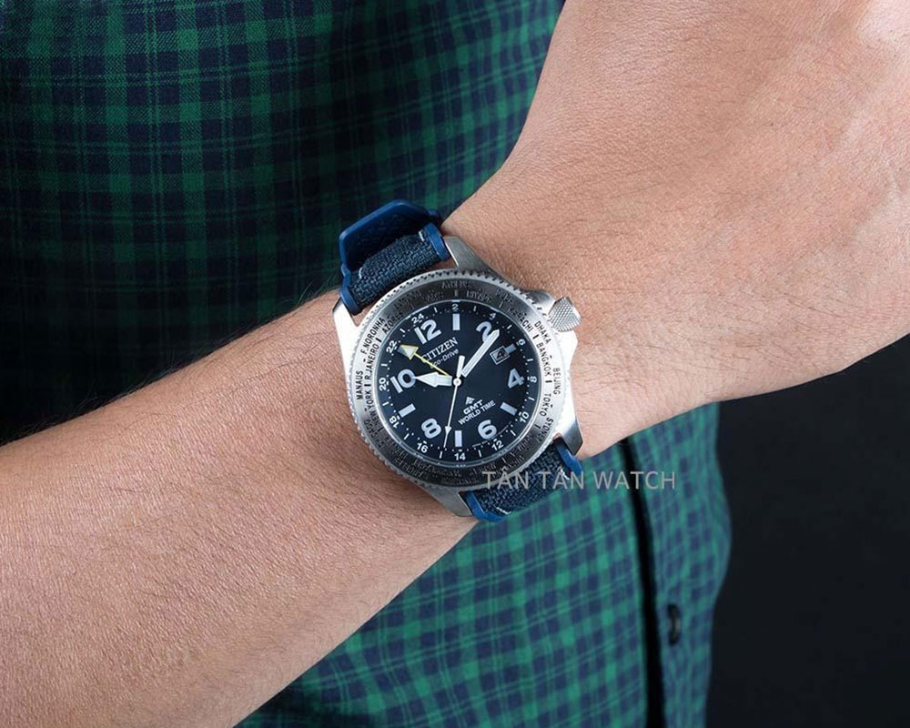 Bằng sự tinh tế trong việc sắp xếp bố cục của hãng, mặt số tuy nhiều chi tiết nhưng lại không tạo cảm giác rối mắt, ngược lại còn tạo nên sự độc đáo và chất “ngầu” cho đồng hồ. Ở góc 3 giờ là ô lịch ngày, dưới góc 6 giờ là logo biểu tượng Promaster, chức năng GMT - World Time, góc 12 giờ là logo Citizen cùng ký hiệu bộ máy Eco-Drive độc quyền.