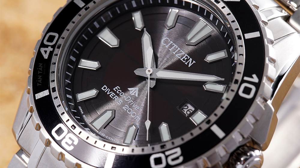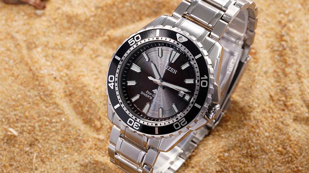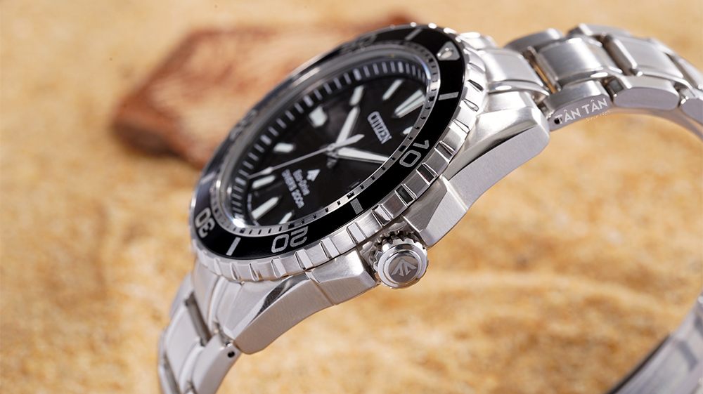 Lựa chọn sắc đen nam tính truyền thống cho mặt số làm điểm nhấn trên tổng thể màu trắng bạc chủ đạo rất thu hút. Phong cách Diver Watch còn được Citizen thể hiện trên phần niềng bezel dạng bánh răng xoay đơn hướng rất độc đáo. Thêm vào đó, ta còn có thể thấy thang đo thời gian được in sắc nét và được phủ dạ quang nổi bật ở mốc 0.