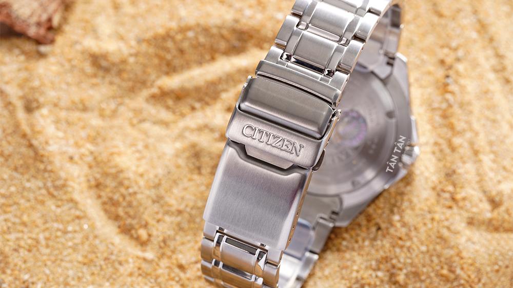 Phần khóa gập kép tiện dụng, dễ dàng thực hiện các thao tác đeo vào - tháo ra và giúp cố định đồng hồ chắc chắn trên tay, không bị rơi khi vận động mạnh hay đang lặn sâu. Điểm nhấn được thiết kế tại khóa cài chính là tên thương hiệu Citizen được dập chìm sang trọng, ấn tượng. Với kích thước 44.5mm, mẫu đồng hồ nam này sẽ phù hợp với các chàng trai có cổ tay 17cm trở lên.