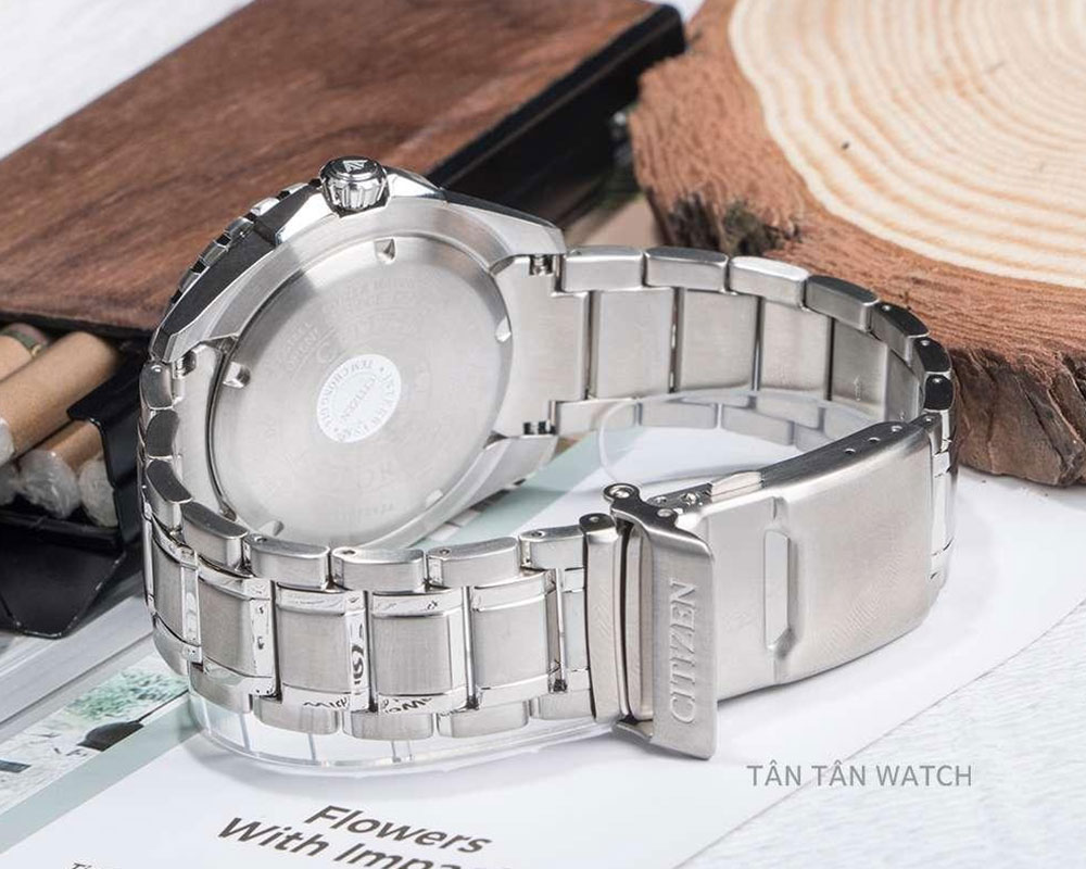 Lựa chọn sắc xanh dương trẻ trung, nam tính thường thấy cho mặt số làm điểm nhấn trên tổng thể màu trắng bạc chủ đạo rất thu hút. Phong cách Diver Watch còn được Citizen thể hiện trên phần niềng bezel dạng bánh răng xoay đơn hướng rất độc đáo. Thêm vào đó, ta còn có thể thấy thang đo thời gian được in sắc nét và được phủ dạ quang nổi bật ở mốc 0.