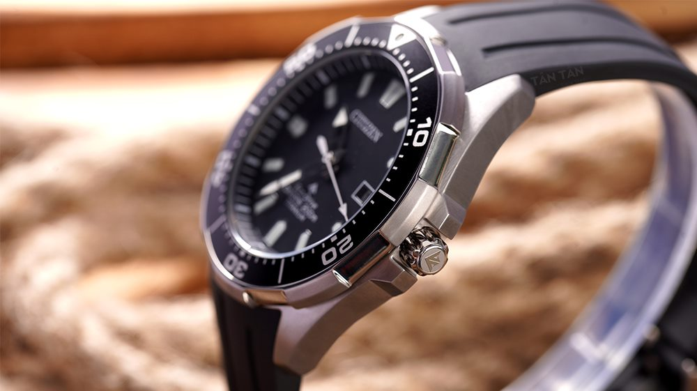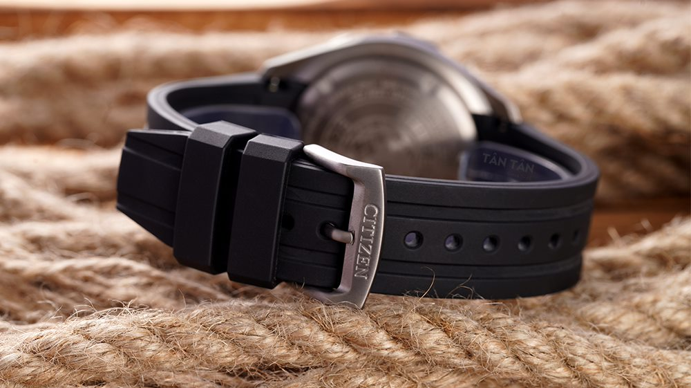 Kết hợp với dây đeo là khóa cài tiện lợi, chất liệu titanium bền bỉ khắc tên thương hiệu Citizen. Đây là dạng khóa rất thường thấy trên những chiếc đồng hồ lặn cao cấp nên rất chắc chắn và thuận tiện trong thao tác tháo mở, cũng như hạn chế tối đa việc đồng hồ rơi khỏi cổ tay khi đang ở dưới biển sâu.