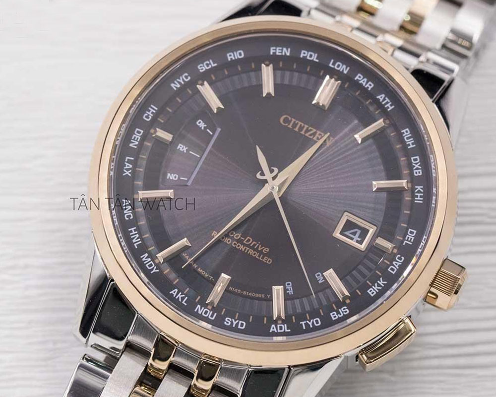 Citizen CB0156-66E không chỉ dừng lại ở việc xem giờ mà còn có những chức năng độc đáo. Bộ máy tích hợp chức năng chỉnh giờ theo tín hiệu radio. Chức năng này sẽ giúp đồng hồ Radio-Controlled Citizen tự động cập nhật giờ đồng nhất với giờ của trạm radio. Khi kim chỉ NO tức không có tín hiệu sóng, OK tức có sóng rất tốt. RX là đồng hồ đang cập nhật giờ, nếu sau khoảng 2-15 phút mà chưa cập nhật được thì đồng hồ sẽ về trạng thái ban đầu. Ngoài ra, các chàng trai còn có thể xem giờ của 26 thành phố chỉ với một thao tác đơn giản là kéo núm chỉnh giờ ra một nấc và điều chỉnh kim giây chỉ vị trí thành phố tương ứng là đồng hồ sẽ tự động cập nhật giờ một cách chính xác.