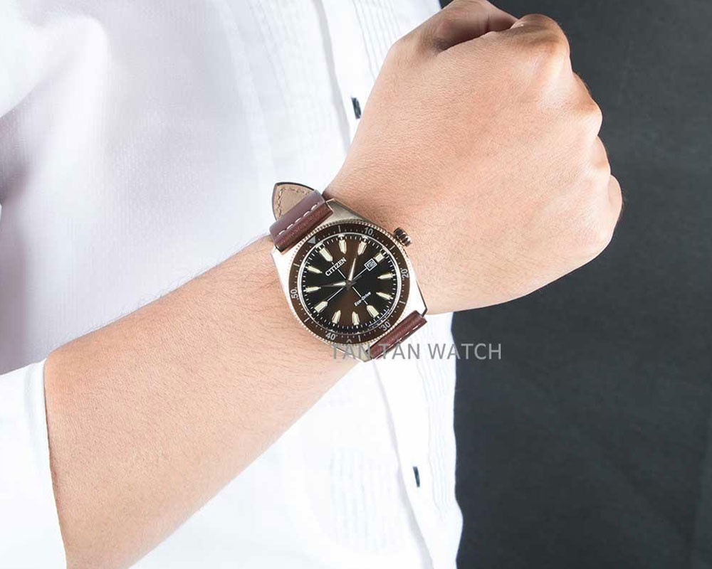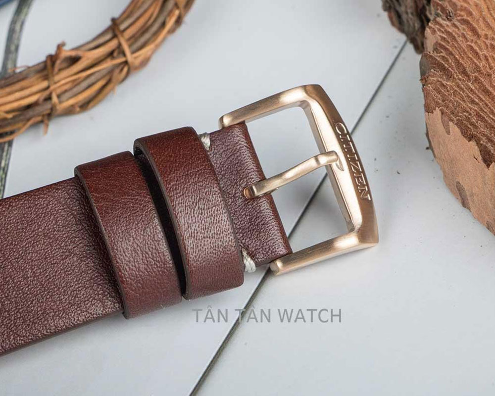 Citizen AW1593-06X được trang bị dây da mềm mại để tôn lên nét lịch thiệp của các chàng trai. Khi xu hướng đồ hồ phong cách thể thao đi vào chốn công sở được các chàng trai văn phòng ưa chuộng vì tính đa năng, màu sắc thời trang và thiết kế vô cùng lịch lãm. Chiếc đồng hồ nam này sử dụng dây da dạng ép với bề mặt vân da thật, thuộc nâu đồng điệu với tổng thể dễ phối đồ. Hơn nữa sử dụng chất da cao cấp giúp giảm trọng lượng đồng hồ, nhẹ nhàng hơn, mềm mại hơn khi đeo trên tay. Đi kèm với dây da là khóa cài đơn giản thường thấy ở những mẫu đồng hồ Citizen dây da, dễ dàng đeo vào hay tháo ra cũng là một điểm cộng.