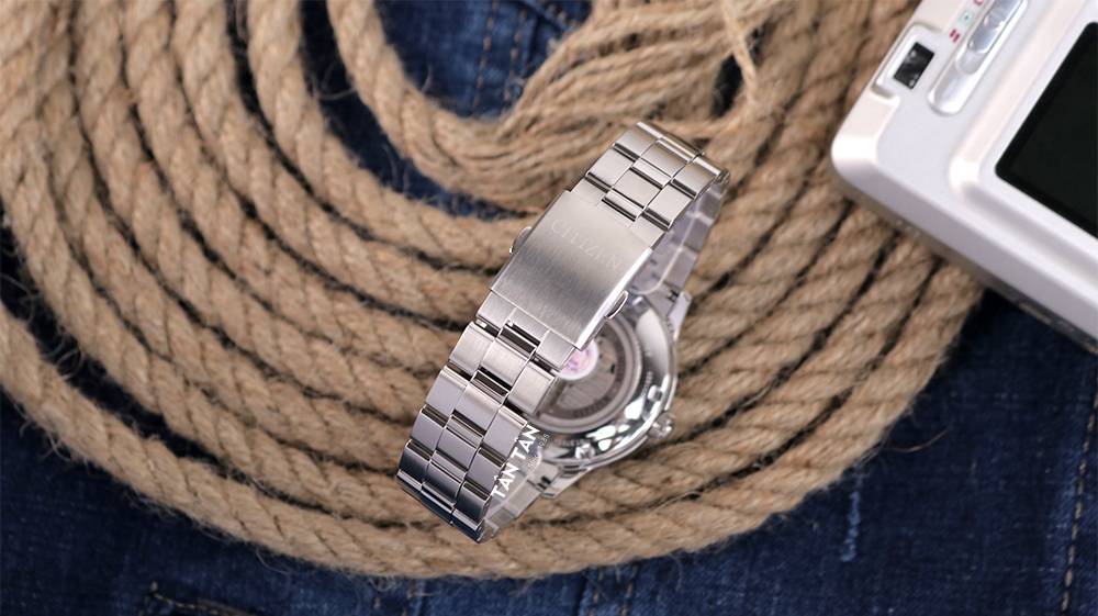 Citizen NK0001-84E trang bị dây đeo thép không gỉ chắc chắn thiết kế 3 mắt truyền thống. Cùng theo đó là khóa gập thường thấy trên những chiếc đồng hồ nam dây kim loại. Điểm mạnh của khóa gập này là sự gọn gàng, tiện lợi và kết hợp với nút bấm thông minh cực kỳ chắc chắn trên cổ tay.