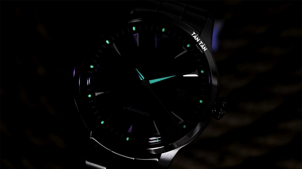 Phía trên các cọc số là các chấm tròn kết hợp cùng bộ kim được phủ dạ quang hỗ trợ các chàng trai quan sát giờ giấc trong điều kiện thiếu sáng.