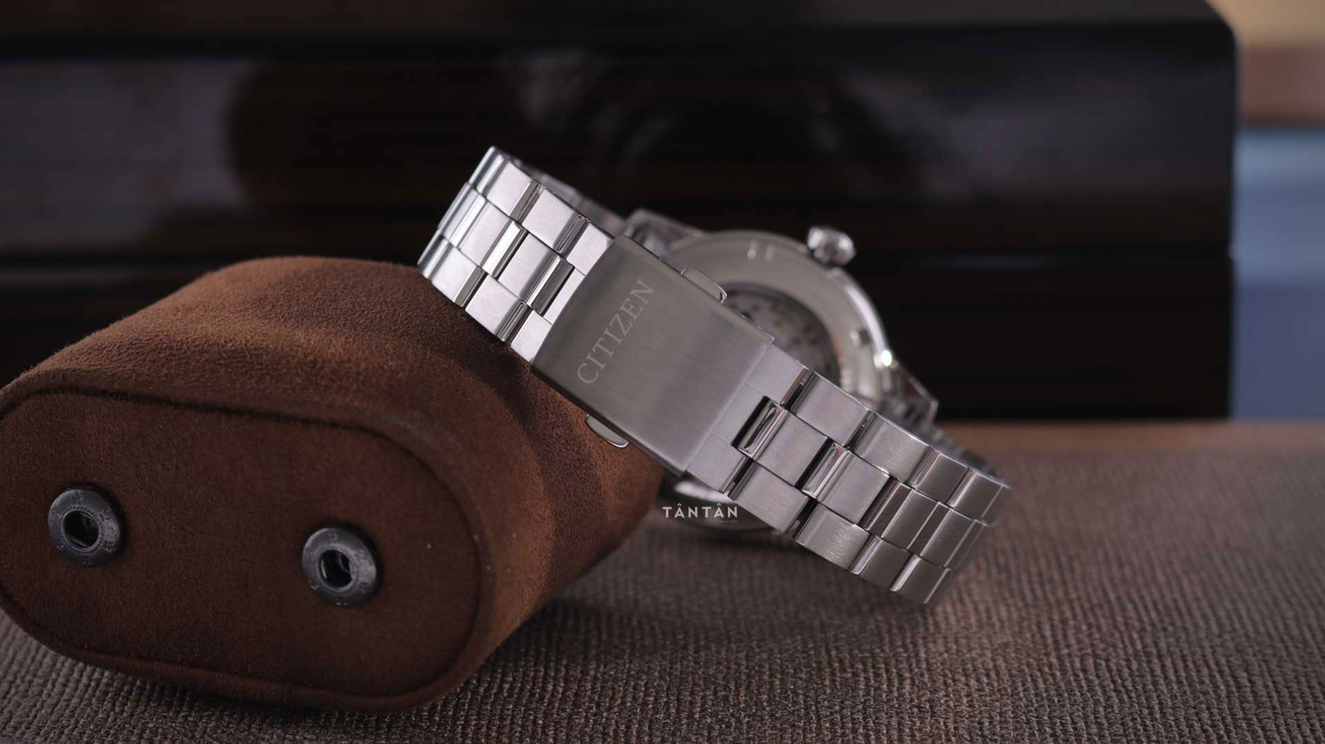 Citizen NK0008-85L trang bị dây đeo thép không gỉ chắc chắn thiết kế 3 mắt truyền thống. Cùng theo đó là khóa gập thường thấy trên những chiếc đồng hồ dây kim loại. Điểm mạnh của khóa gập này là sự gọn gàng, tiện lợi và kết hợp với nút bấm thông minh cực kỳ chắc chắn trên cổ tay.