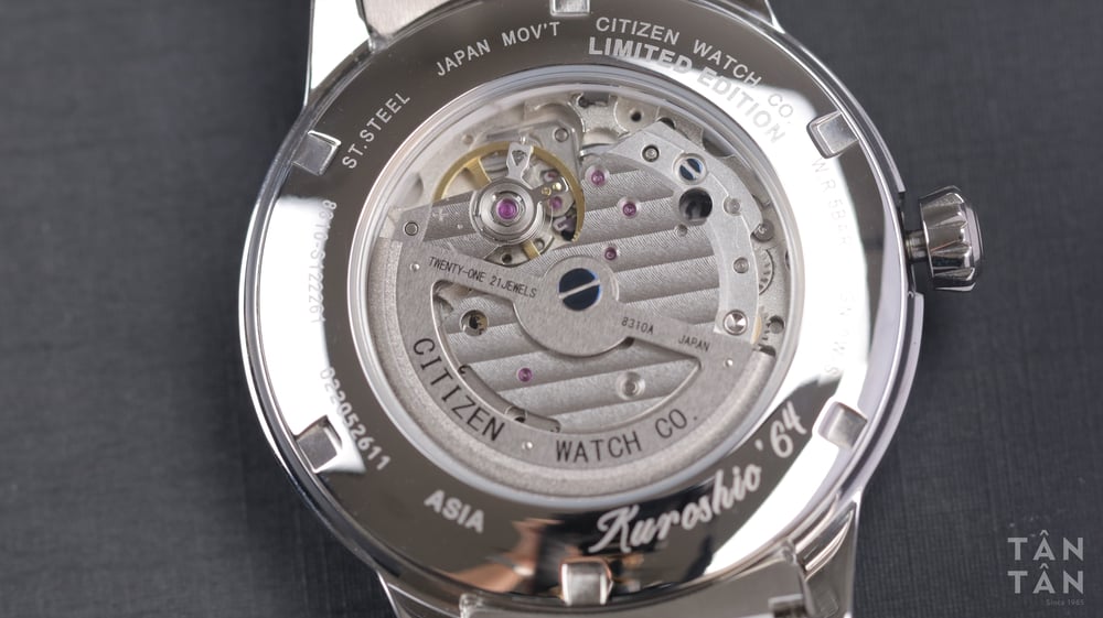 Ở mặt đáy, Citizen NK0009-82L có thiết kế lộ máy và được bảo vệ bằng kính Sapphire có độ cứng cao giúp bảo vệ bộ máy bên trong một cách an toàn nhất. Ngoài ra, mặt đáy còn in số hiệu của chiếc đồng hồ, đánh dấu đó là chiếc thứ bao nhiêu trong 1959 chiếc được sản xuất.