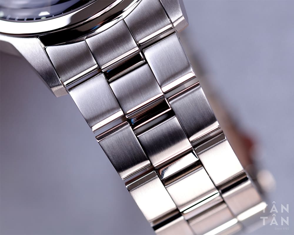 Bộ vỏ được đánh phay xước dọc, bộ dây được đánh phay xước ngang và viền bezel được đánh bóng tạo nên điểm nhấn trên đồng hồ, thu hút ánh nhìn của người khác. Ở cạnh phải là nút chỉnh giờ được hoàn thiện to, nổi bật hơn so với phiên bản tiền nhiệm.