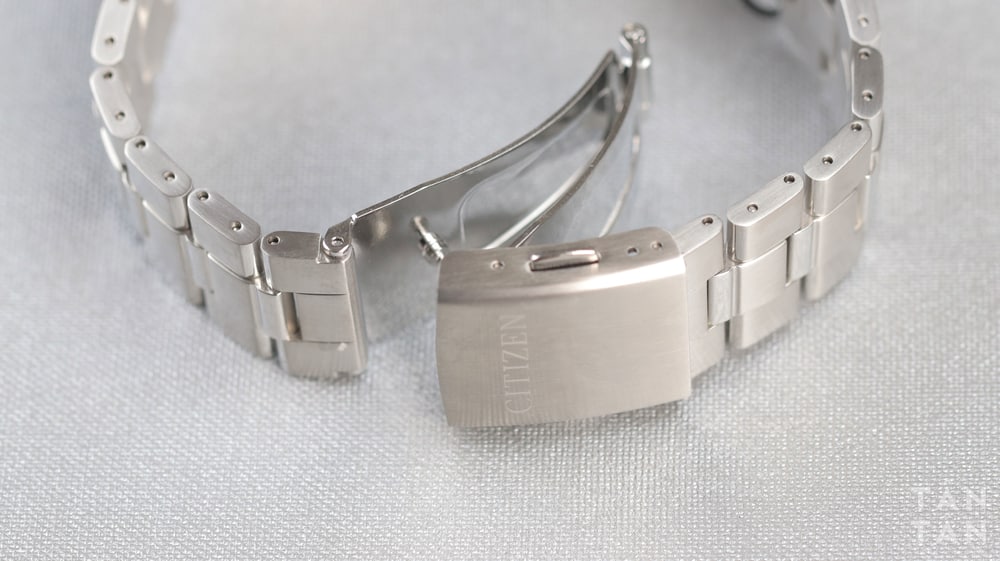 Dây đeo của của đồng hồ nam Citizen NK0009-82L gồm 1 mắt lớn nhưng được làm với hiệu ứng giả 3 mắt, mang đến độ chắc chắn khi đeo trên tay. Khóa cài dây đeo là khóa thép gập giúp người dùng dễ dàng tháo ra đeo vào.
