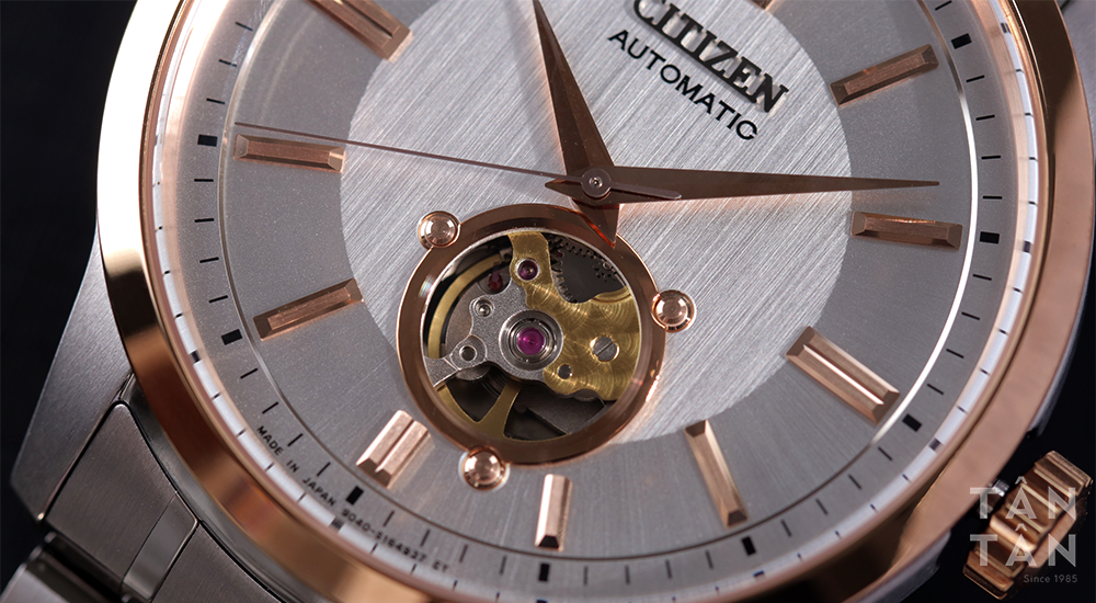 Đặc biệt, Vì nằm trong bộ Citizen hở máy Open Heart nên Citizen NB4024-95A cũng sử dụng cách thiết kế mặt số lộ máy Open Heart độc đáo. Cửa sổ lộ tim được đặt ở góc 5h30 với viền thép vàng hồng nổi bật đem đến cho Citizen NB4024-95A sự sang trọng tuyệt đối. Trên góc 12 giờ là tên thương hiệu Citizen nổi khối trên bề mặt cùng dòng chữ Automatic.