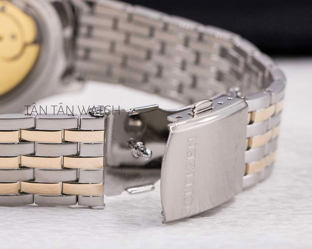 Dây đeo của Citizen NH7504-52E được làm từ thép đúc đặc với thiết kế 7 mắt mềm mại, cực kỳ ôm cổ tay nhưng vẫn đảm bảo độ chắc chắn, không đứt gãy khi va đập mạnh. Nhà sản xuất còn tỉ mỉ mạ PVD xen kẽ màu vàng hồng thời thượng, kết hợp đánh bóng và đánh phay xước luân phiên để tạo nên hiệu ứng chuyển sáng bắt mắt khi người dùng chuyển động cổ tay.