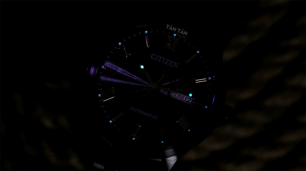 Ở viền ngoài, tại vị trí mỗi cọc số Citizen còn điểm thêm các ô vuông tinh tế phủ dạ quang, kết hợp cùng đầu kim dạ quang, Citizen NH7505-84E có khả năng hiển thị giờ giấc rõ ràng trong bóng tối.