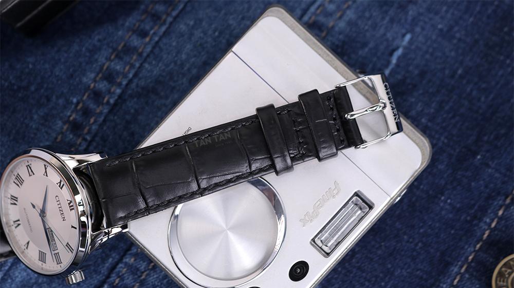 Thêm vào đó, Citizen NH8360-12A được trang bị dây đeo chất da cao cấp thuộc màu đen trẻ trung, lịch lãm. Phần dây da được các nghệ nhân dập vân cá sấu, chạy chỉ viền chắc chắn, tạo sự độc đáo và bắt mắt cho thiết kế. Nhờ chất liệu da mềm mại, các chàng có thể thoải mái đeo suốt thời gian dài và dễ dàng kết hợp với nhiều outfit khác nhau trong tủ đồ của mình. Đi kèm với đồng hồ là khóa cài đơn giản, dễ dàng đeo vào tháo ra. Ngoài ra, phần cuối khóa cài còn được dập logo Citizen sắc nét, thể hiện trình độ hoàn thiện tinh tế và tỉ mỉ trong từng chi tiết.