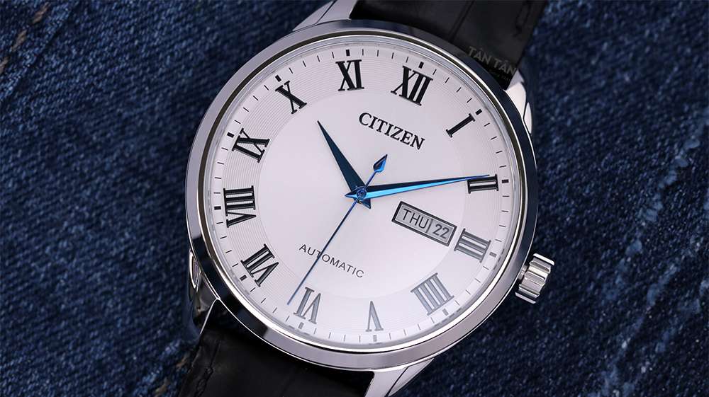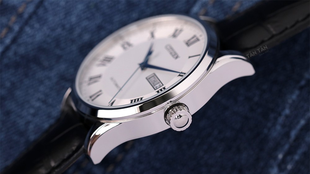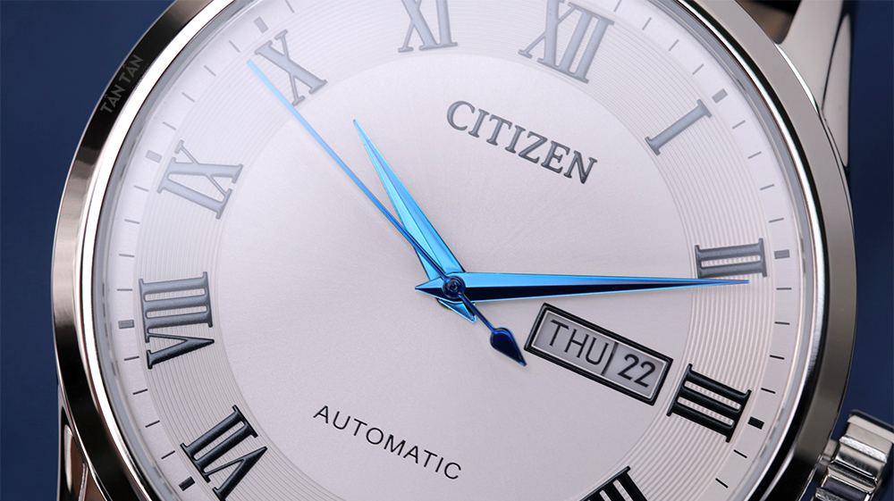 Bao bọc xung quanh là các vòng tròn đồng tâm chứa các mốc giờ dạng số La Mã sắc nét màu đen to rõ, cùng vạch chia phút được thiết kế đều đặn, giúp các chàng trai thoải mái xem giờ trong quá trình sử dụng. Tại góc 12 giờ la logo Citizen, đối xứng phía dưới là tên bộ máy Automatic chỉn chu, khẳng định giá trị vượt trội của đồng hồ. Tại góc 3h là ô lịch thứ - ngày được viền khung đen giúp người dùng dễ dàng quản lý thời gian. Đặc biệt, bảo vệ mặt số là lớp kính khoáng cứng cáp và có độ bền cao. Đây là loại kính thường được Citizen sử dụng bởi khả năng bảo vệ tối ưu và dễ đánh bóng lại khi đồng hồ bị trầy xước.