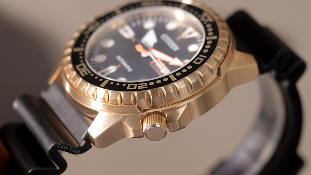 Phong cách đồng hồ lặn còn được thể hiện qua niềng bezel dạng bánh răng xoay độc đáo cùng thang đo thời gian được in sắc nét và phủ dạ quang nổi bật ở mốc 0. Nhìn kỹ hơn ta có thể thấy niềng bezel được bảo vệ bởi vòng thép ôm tròn theo nó. Núm vặn screw-down đặc trưng của đồng hồ lặn có dạng nắp chai được hoàn thiện với các đường khía sắc nét mang lại sự thuận tiện trong thao tác điều chỉnh. Thêm vào đó, núm chỉnh cũng được đặt ở góc 4 giờ mang lại sự khác biệt cũng như tránh bị cấn tay. Bảo vệ cho núm chỉnh là hai phần gờ thép cứng cáp, thể hiện sự mạnh mẽ cần có của một chiếc đồng hồ thể thao.