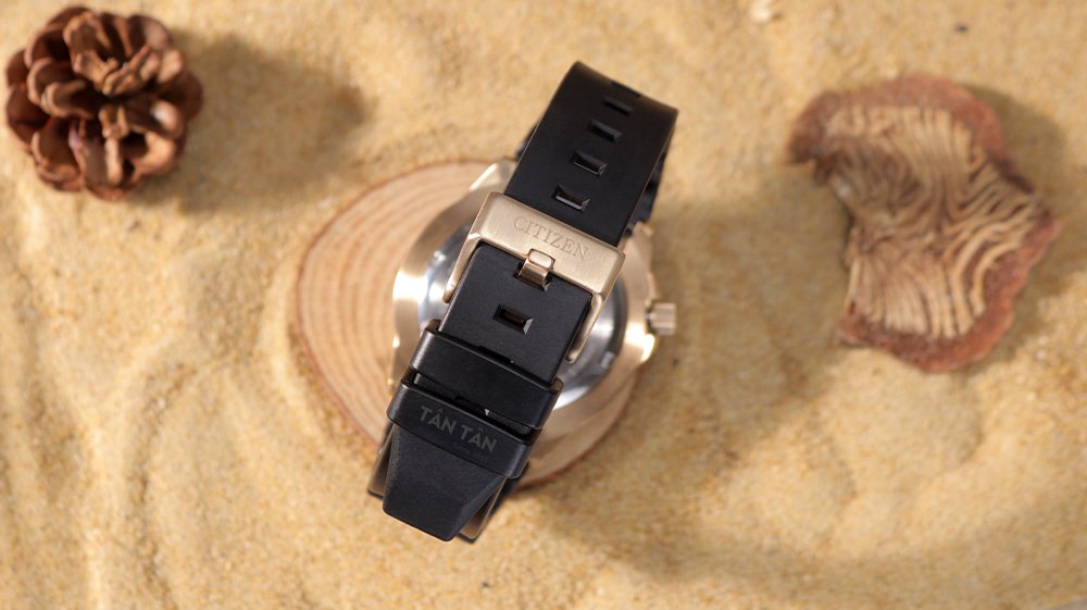 Ngoài ra, ta có thể thấy phần đuôi dây có thiết kế uốn lượn để tăng độ bền bỉ cho dây và giúp tay thông thoáng, không gây bí khi đeo, mang lại giá trị sử dụng lâu dài. Kết hợp cùng dây cao su là khóa cài thường thấy với ưu điểm là sự chắc chắn và thuận tiện trong thao tác tháo mở. Trên khóa cũng được khắc chìm logo Citizen đầy tinh tế, khẳng định giá trị thương hiệu đồng hồ.