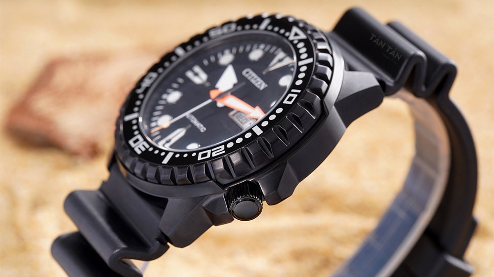 ✓ Tổng thể phủ màu đen nam tính với thiết kế mang phong cách đồng hồ lặn kết hợp niềng bezel xoay độc đáo.