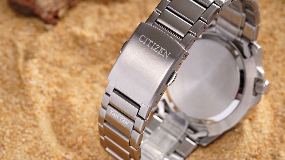Thêm vào đó, toàn bộ bề mặt dây đeo 3 liên kết này được hoàn thiện xước phay thẩm mỹ, hạn chế xước dăm mang đến khả năng bắt sáng cao. Kết hợp cùng dây kim loại là khóa gập thường thấy với ưu điểm là sự chắc chắn và thuận tiện trong thao tác tháo mở nhờ nút trang bị thêm nút bấm tiện lợi. Trên khóa cũng được khắc chìm logo Citizen đầy tinh tế, khẳng định giá trị thương hiệu đồng hồ.