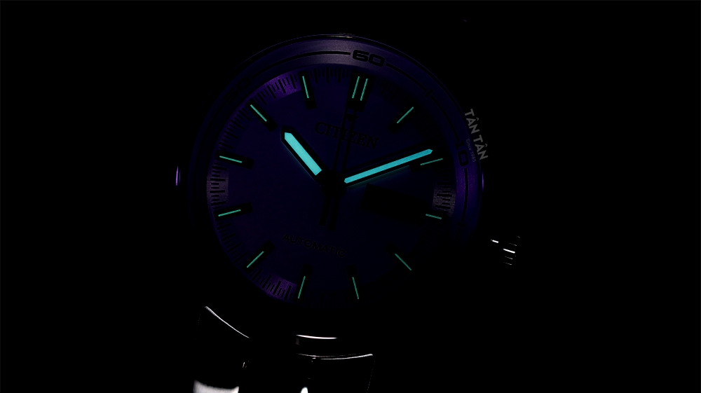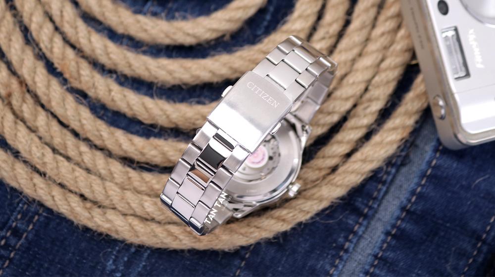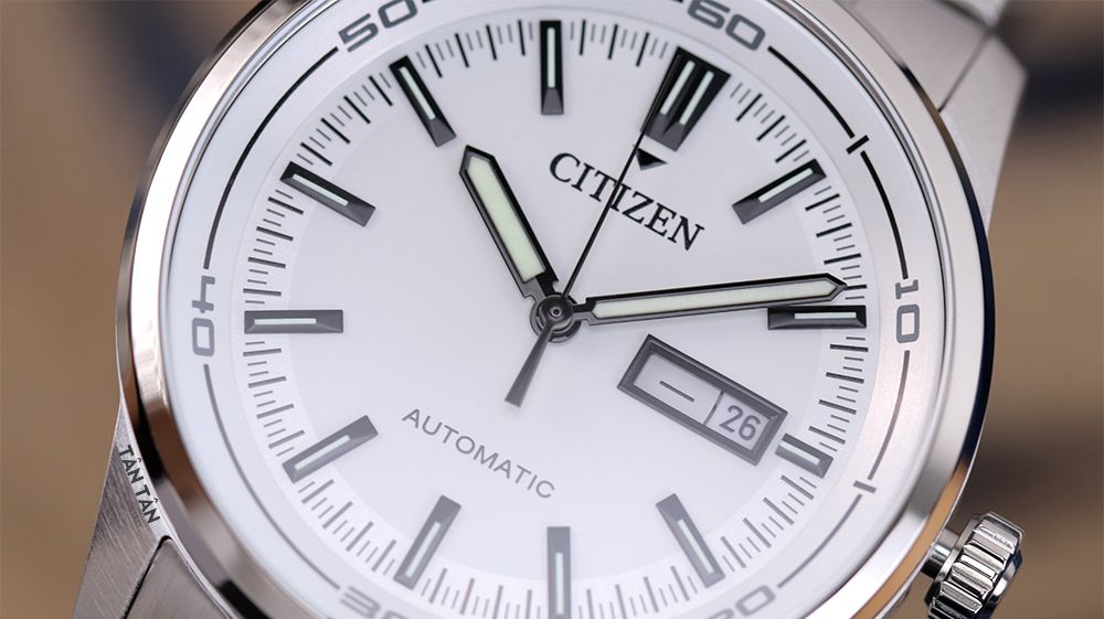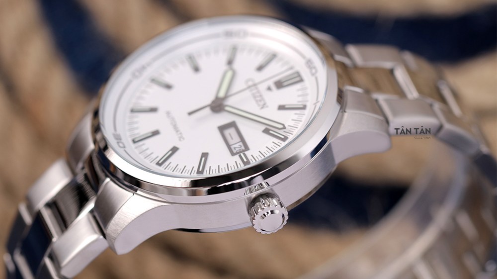 Logo Citizen và ký hiệu bộ máy Automatic được đặt đối xứng qua trục kim tại vị trí 12-6 giờ như một điểm đặc trưng của thương hiệu. Tính năng lịch thứ, lịch ngày được đặt gọn gàng tại vị trí 3 giờ và được viền lại bằng viền đen tạo sự khác biệt và làm cho mặt số có chiều sâu hơn.