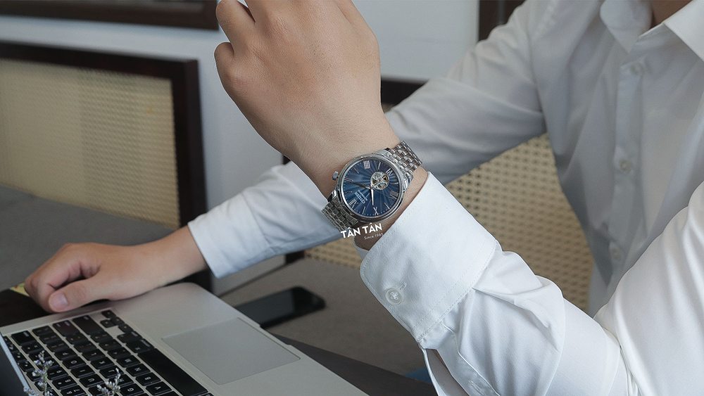 2. Mặt số màu xanh dương với những đường vân Guilloche Flinqué sắc nét cùng thiết kế Open-heart độc đáo