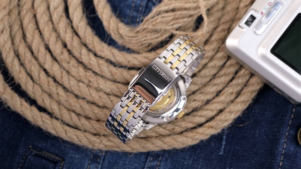 Citizen NJ0084-59A với dây đeo tinh tế, hiện đại, hài hòa với nét cổ điển của mặt số đồng hồ. Toàn bộ dây được làm từ thép không gỉ với thiết kế 7 mắt uyển chuyển, phối màu demi vàng gold với bề mặt sáng bóng sắc sảo, sang trọng. Những mắt dây nhỏ gắn kết với nhau vừa chắc chắn, vừa mềm mại cực kỳ ôm tay và tạo cảm giác thoải mái khi đeo.
