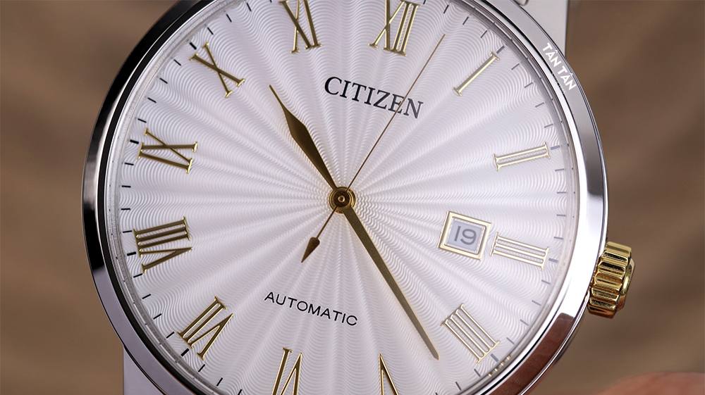 Ở góc 3 giờ là ô lịch ngày được đặt trong ô vuông thép nhỏ gọn, góc 12 giờ là tên thương hiệu Citizen cao cấp và góc 6 giờ là tên bộ máy Automatic. Bao bọc mặt số là lớp kính sapphire cao cấp với độ chống trầy xước và chịu lực cao, bảo vệ tuyệt đối các chi tiết bên trong mặt số.