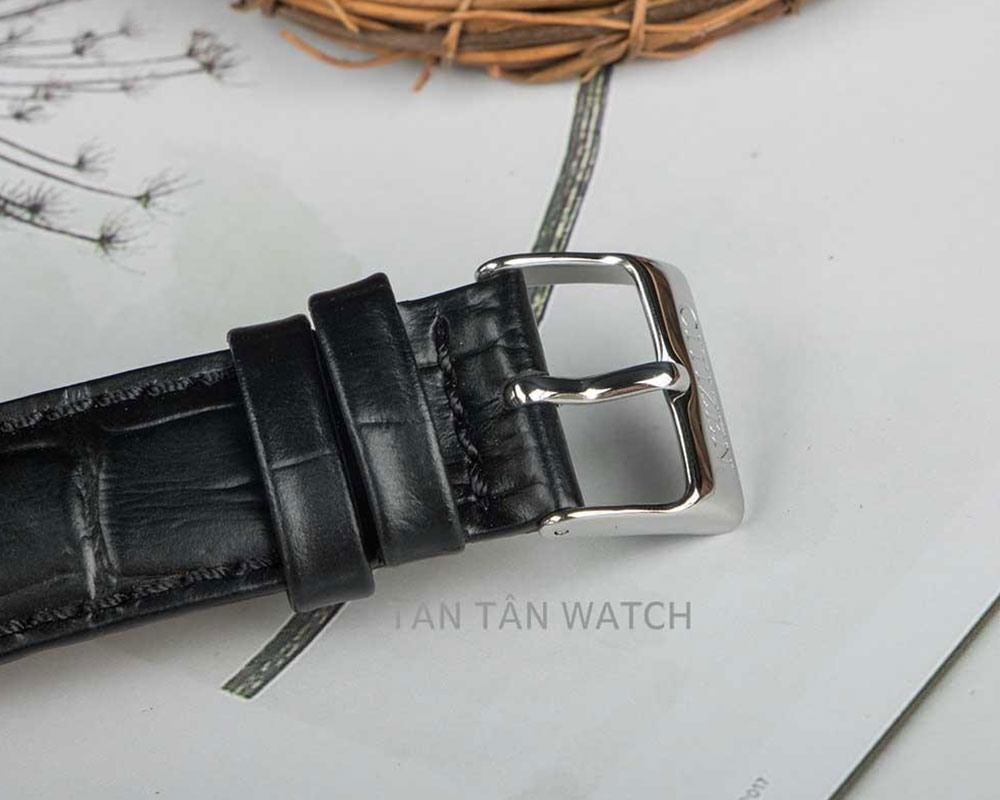 Dây da kết cấu hai lớp với bề mặt thuộc đen dập vân sang trọng được may liền lạc với mặt trong mềm mại