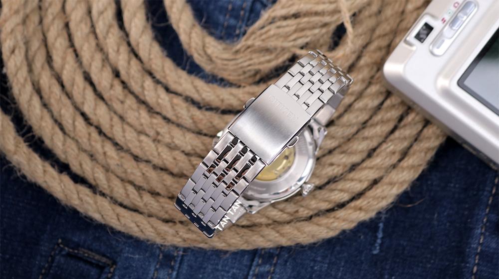 Cuối cùng, đi kèm với đồng hồ là dây đeo được làm từ chất liệu thép không gỉ cao cấp được thiết kế 7 mắt nhỏ nhắn, liên kết với nhau chặt chẽ và ôm sát vào tay. Khi mang sẽ tạo cảm giác dễ chịu và cực kỳ tôn da, liền lạc với dây đeo là phần cuối dây đeo là khóa gập thường thấy trên đồng hồ kim loại. Loại khóa này rất tiện dụng, dễ dàng tháo lắp, tạo sự thuận tiện cho các quý ông khi dùng. Các nghệ nhân nhà Citizen đã khéo léo kết hợp kỹ thuật đánh bóng kết hợp xớ mờ tạo nên diện mạo hoàn hảo cho đồng hồ, hạn chế trầy xước và giữ màu bền đẹp với thời gian.