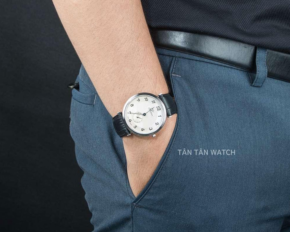 Mặt số trắng hoàn thiện vân Guilloche "quả trám", nổi bật bộ kim xanh mắt ngỗng cùng small-second độc đáo