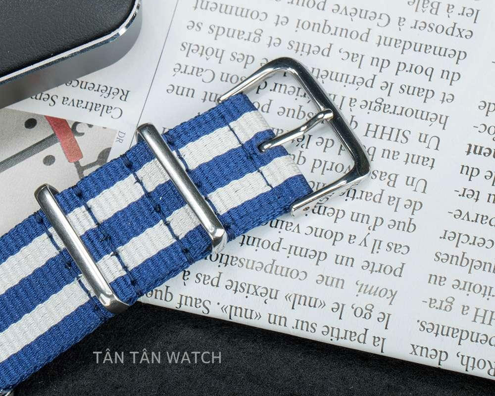 Bộ vỏ với độ dày 8.7mm mỏng nhẹ nhờ trang bị bộ máy Quartz bên trong, giúp đồng hồ nhẹ hơn, đi kèm là dây vải mềm nhẹ mang lại sự thoải mái khi đeo, màu trắng sọc xanh dương tạo nên phong cách trẻ trung và thời trang hơn. Đi kèm với dây vải là khóa cài đơn giản dễ đeo vào hay tháo ra cùng với độ chống nước là WR100 có thể sử dụng nước thoải mái như đi mưa, rửa tay, đi tắm và ngoài ra có thể bơi nhẹ.