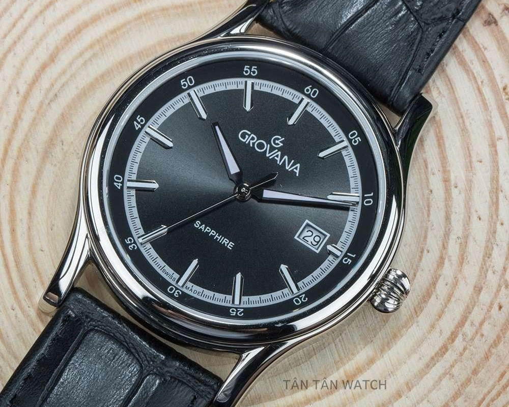 Grovana 1734.1537 với bộ vỏ thép không gỉ đánh xước phay, có niềng trắng đánh sáng bóng làm nổi bật mặt số tròn màu đen bên trong. Mặt số được hoàn thiện bề mặt tỉ mỉ với các vân sunray đồng tâm cho độ thẩm mỹ và chuyển sáng cao. Nổi bật phía trên là bộ 3 kim dang alpha, các vạch giờ index màu bạc cùng vòng tròn chia vạch đếm giây màu trắng.