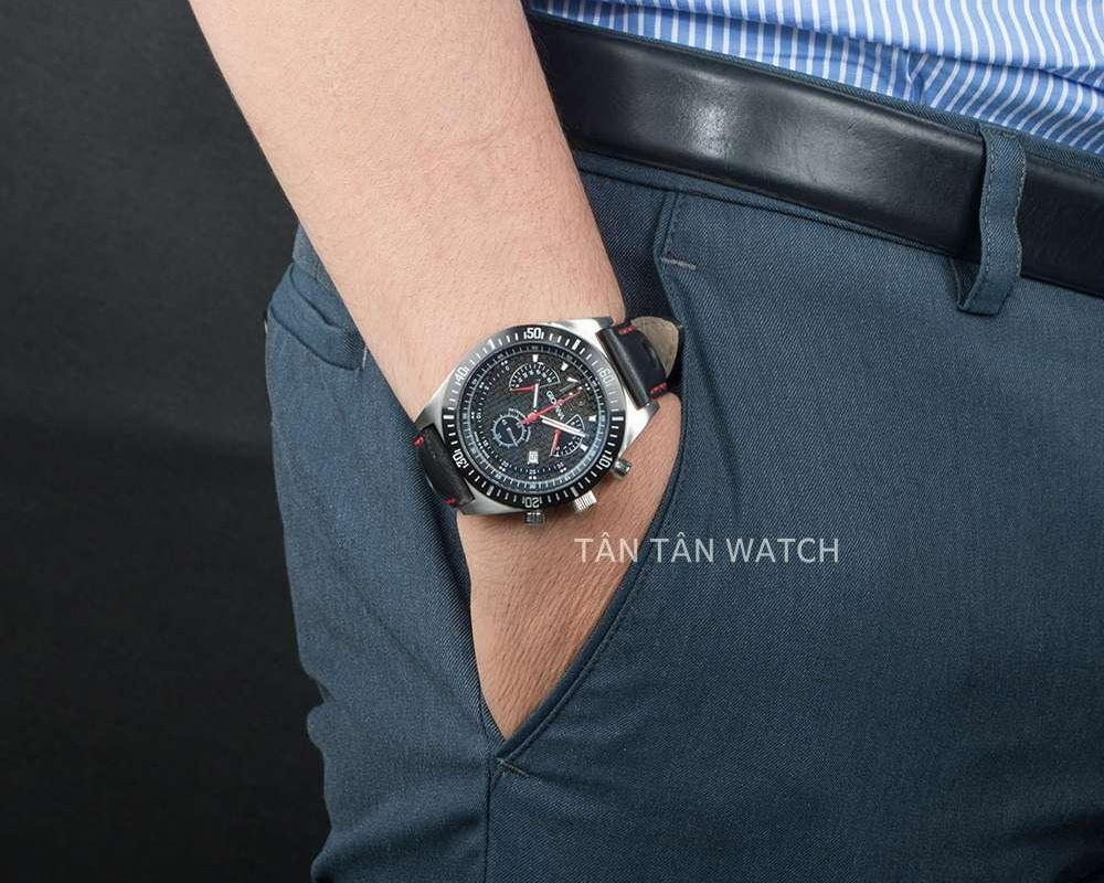 Hãng Grovana của Thụy Sĩ nổi tiếng với bộ máy Retrograde và Big Date khá đặc trưng. Mẫu 1620.9576 nay kết hợp chất liệu Carbon Fiber có độ bền gấp 5 lần và cứng gấp 2 lần thép để hoàn thiện mặt số. Tích hợp các chức năng bấm giờ thể thao, dựa trên cơ chế nhảy giờ giật lùi của bộ phận máy Retrograde, một chức năng luôn đòi hỏi sự tỉ mỉ và tay nghề chế tác cao.