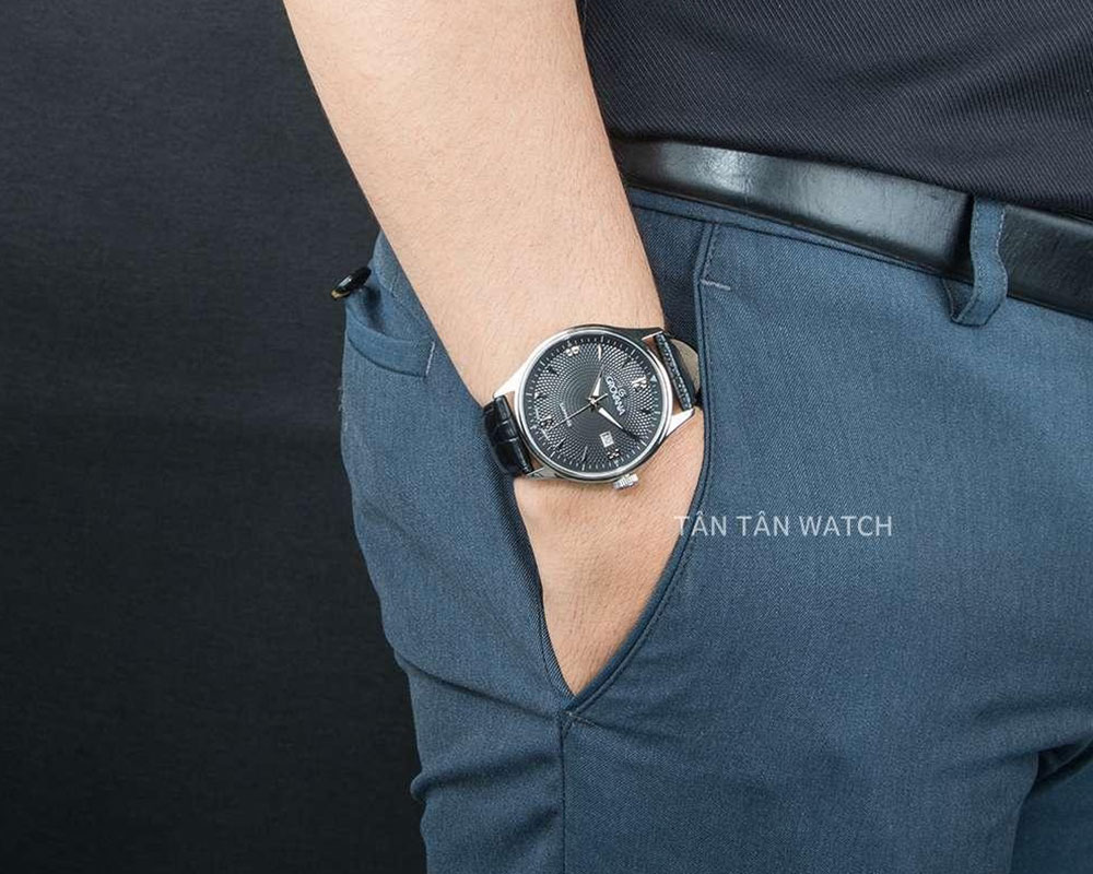 Thiết kế đơn giản sang trọng với 3 kim, 1 lịch ngày, phối màu đen tổng thể dễ phối đồ