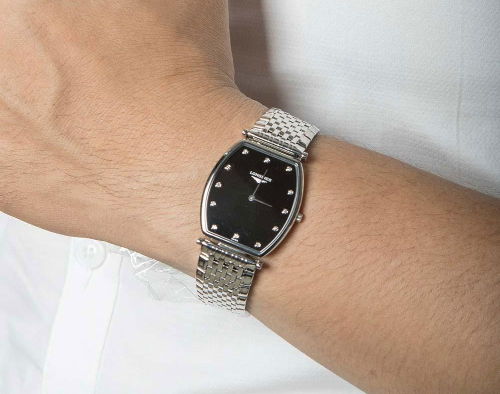 Mặt số mang màu đen tuyền trầm tĩnh chính là chi tiết có nét đẹp có thể cuốn lấy ánh mắt của người nhìn. Đây là màu sắc thường thấy và có tính ứng dụng cao, đồng thời tôn lên tinh thần thiết kế tinh giản, thời thượng, phù hợp với mọi thời đại. Vì thuộc dòng Longines kim cương nên điểm đắt giá nhất mặt số là 12 viên kim cương vuông vức đính tại 12 mốc giờ, góp phần tăng thêm giá trị cho món “trang sức” này.
