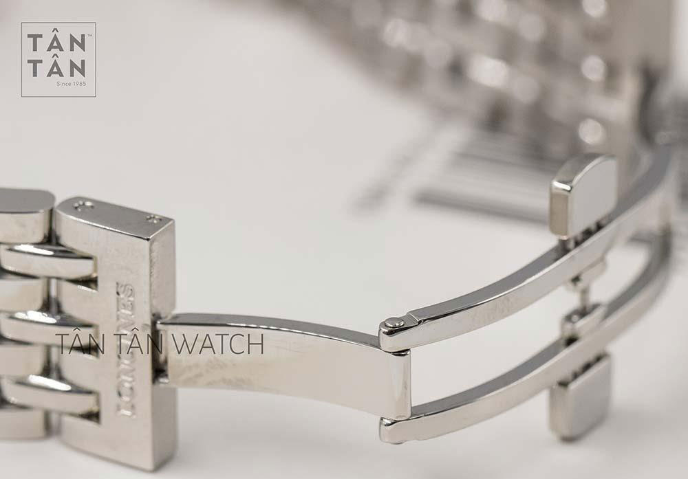 Dây đeo Longines L4.898.4.72.6 bằng thép không gỉ với thiết kế các mắt nhỏ dài, sắp xếp xen kẽ đều đặn rất tỉ mỉ để tạo nên chuỗi liền mạch. Toàn bộ dây đeo được đánh bóng kỹ lưỡng với độ bắt sáng cao, tạo ra sự lấp lánh và nổi bật cho chiếc đồng hồ này. Đây là loại dây đeo được các khách hàng nam ưa chuộng hiện nay với độ mỏng nhẹ, mang đến sự sang trọng và hiện đại. Đi kèm theo đó là dạng khóa cân bằng chắc chắn, với cơ chế mở gập đẩy tăng thêm gấp 3 lần độ an toàn khi đeo. Mặt ngoài khóa được dập nổi tên thương hiệu và logo Longines tinh tế, khẳng định giá trị của chiếc đồng hồ.