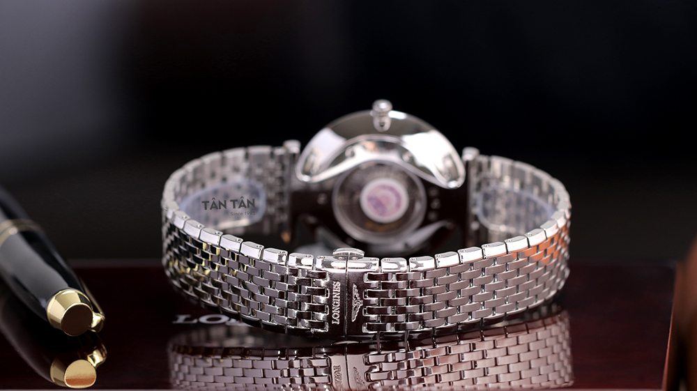 Dây đeo Longines L4.918.4.71.6 bằng thép không gỉ với thiết kế các mắt nhỏ dài, sắp xếp xen kẽ đều đặn rất tỉ mỉ để tạo nên chuỗi liền mạch. Toàn bộ dây đeo được đánh bóng kỹ lưỡng với độ bắt sáng cao, tạo ra sự lấp lánh và nổi bật cho chiếc đồng hồ này. Đây là loại dây đeo được các khách hàng nam ưa chuộng hiện nay với độ mỏng nhẹ, mang đến sự sang trọng và hiện đại. Đi kèm theo đó là dạng khóa cân bằng chắc chắn, với cơ chế mở gập đẩy tăng thêm gấp 3 lần độ an toàn khi đeo. Mặt ngoài khóa được dập nổi tên thương hiệu và logo Longines tinh tế, khẳng định giá trị của chiếc đồng hồ.