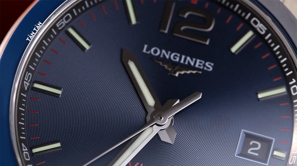 Bên cạnh đó, logo thương hiệu “Longines” sắc nét được đặt tại góc 12h, cùng dòng chữ VHP màu đỏ và thông số 5bar phía dưới bộ kim khẳng định dấu ấn riêng cùng chất lượng đẳng cấp của đồng hồ. Ô lịch ngày đặt gọn gàng và nổi bật tại vị trí 3h giúp người đeo dễ dàng quản lý lịch trình. Tất cả chi tiết được sắp xếp một cách tinh giản, hài hòa và thống nhất với tổng thể, tôn lên vẻ đẹp nam tính và mạnh mẽ của các quý ông.