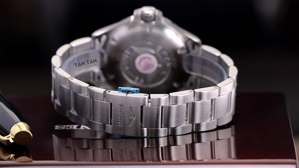 Để hoàn thiện tổng thể, Longines Conquest V.H.P L3.728.4.56.6 còn được trang bị dây đeo kim loại bằng thép không gỉ cao cấp có độ bền cao. Các nghệ nhân sử dụng kỹ thuật đánh phay xước bằng công nghệ cao giúp dây đeo luôn sáng bóng và bền màu với thời gian. Ngoài ra, dây đeo còn sở hữu khóa đôi được thiết kế chốt gấp ba lần an toàn và mở theo cơ chế đẩy, dễ dàng tháo ra và lắp vào, giúp cố định vừa vặn và chắc chắn trên cổ tay.