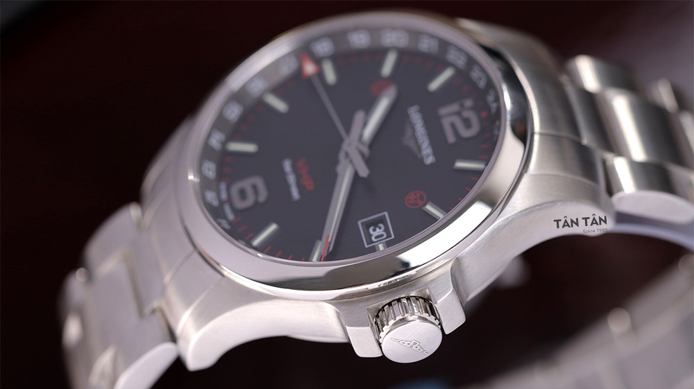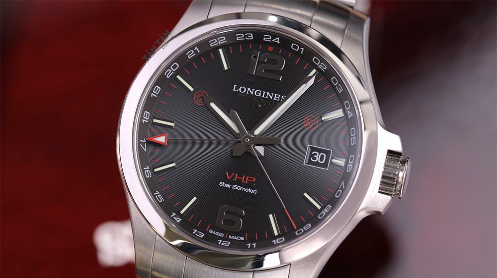Bên cạnh đó, logo thương hiệu “Longines” sắc nét được đặt tại góc 12h, cùng dòng chữ VHP màu đỏ và thông số 5bar phía dưới bộ kim khẳng định dấu ấn riêng cùng chất lượng đẳng cấp của đồng hồ. Ô lịch ngày đặt gọn gàng và nổi bật tại vị trí 3h giúp người đeo dễ dàng quản lý lịch trình. Ngoài ra, phần mặt số đồng hồ còn có hình ngôi nhà và máy bay ở góc 10h và 2h, cũng như sự xuất hiện thêm kim chỉ giờ GMT có hình mũi tên tam giác chỉ 24 số được khắc trên viền ngoài mặt số chỉ có trên những dòng Longines GMT. Tất cả chi tiết được sắp xếp một cách tinh giản, hài hòa và thống nhất với tổng thể, tôn lên vẻ đẹp nam tính và mạnh mẽ của các quý ông.